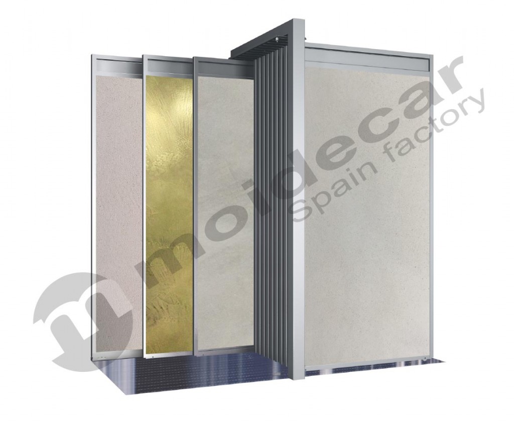 Expositor simple de tipo corredero a una cara, con base de acero. Iluminación opcional. Disponible en varios formatos.